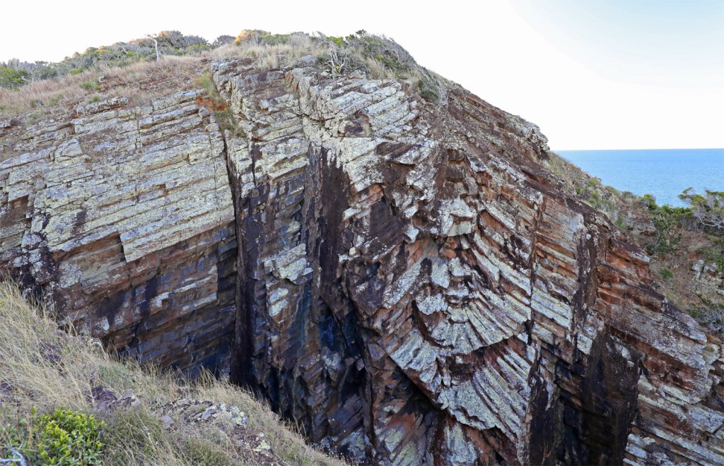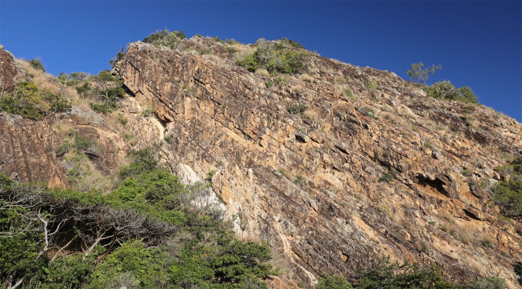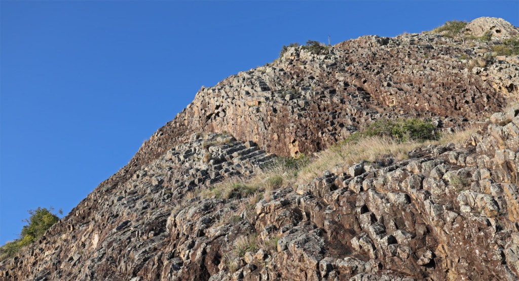 Columnar jointing on the western side of Double Head. The trachyte plugs are between 73 and 79 million years old.