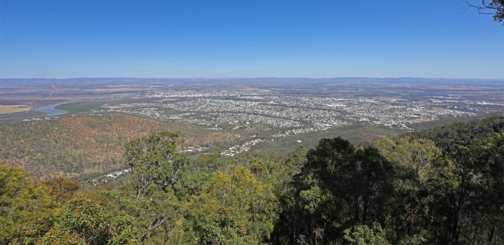 Mount Archer is a 604 metre mountain that is a backdrop to Rockhampton. A steep road from Frenchville leads to the national park at the summit. This is the view west over town with the Fitzroy River on the left of the image.