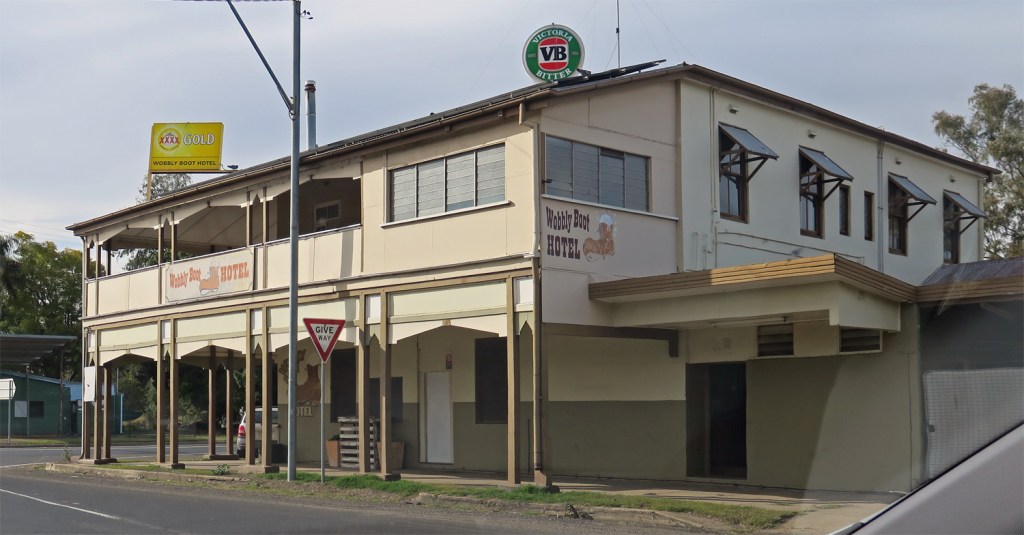 Wobbly Boot Hotel in Boggabilla – the wobbly boot is surprisingly light – it’s made from carbon dyed ox hide.