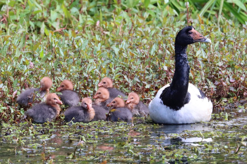 Mother Magpie goose and her goslings. She named her first-hatched “Ryan”.
