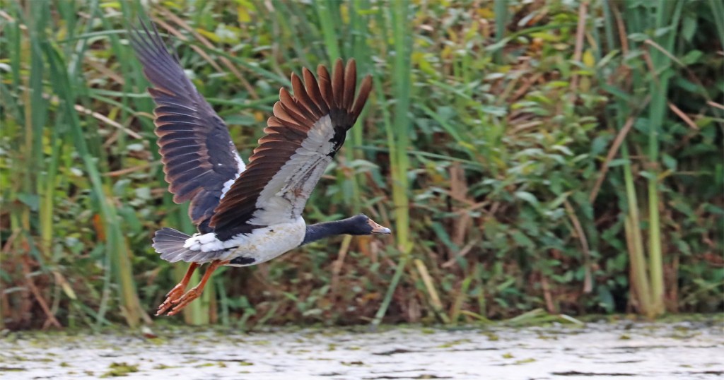 A squadron of magpie geese coming in to land at Baldwin Swamp. Take a gander at that!