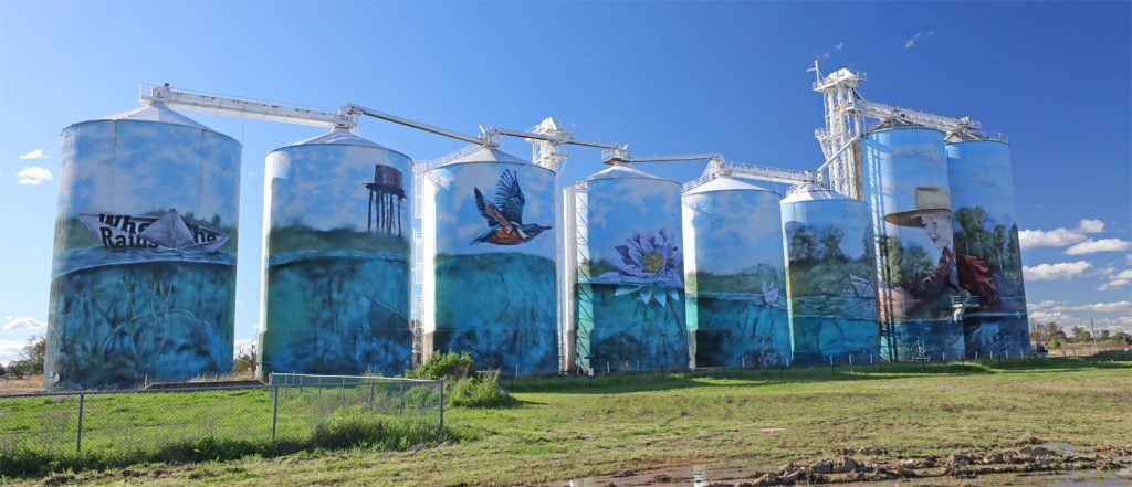 Yelarbon Silo Art – the mural concept titled ‘When the rain comes’ depicts a young boy at play, cooling off in the Yelarbon Lagoon. In his hand is a paper boat that floats across the Yelarbon lagoon. The young fella on the two larger silos is very competent in the water – he’s a good buoy.