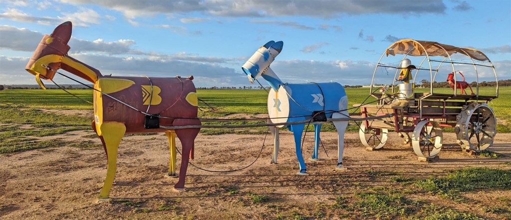 The West Kulin Whopper on the road to Corrigin well after sunset – this sculpture is away from the bulk of the other horse sculptures and the biggest, set off the road in a paddock. The creators said that this horse sculpture is far superior to all the others but were told to get off their high horse.