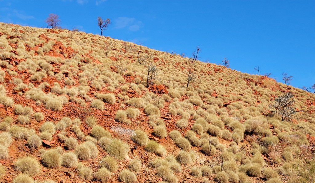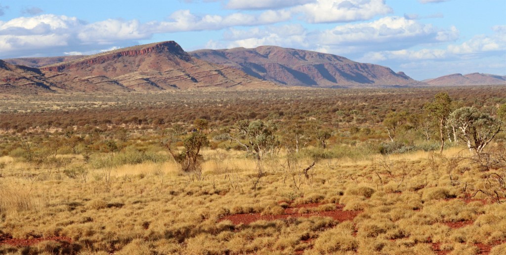 Leaving Newman, the plains disappear being replaced by sweeping red mountain ranges clothed in spinifex.