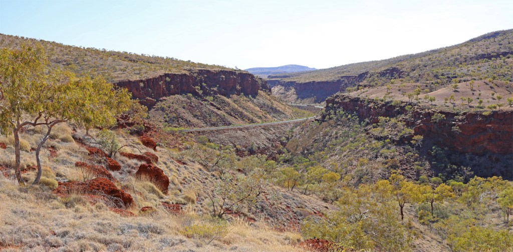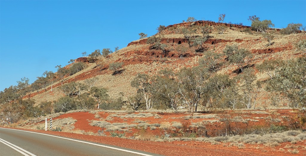 Auski Roadhouse – apart from the scattered groupings of grey nomads in dusty and rocky roadside camps, this is the only “civilisation” between the outskirts of Port Hedland and Tom Price (shop or habitation) in our 420km of driving today. Turn left here, travel 40km and you end up at Wittenoom – made infamous as the deadliest town in Australia from asbestos waste (referenced in Blue Sky Mine by Midnight Oil).
