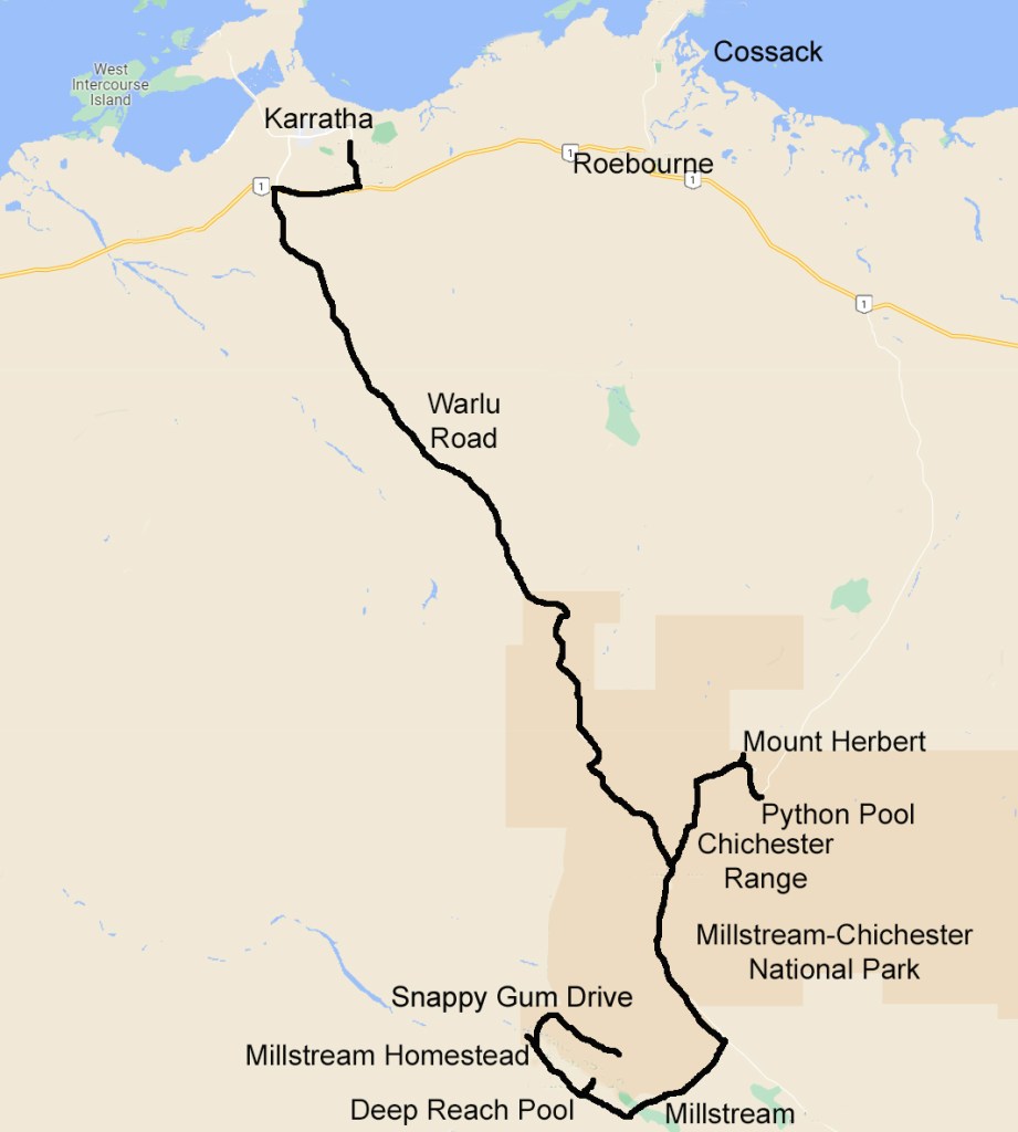 It consists of two main areas – the Chichester Range (above and below) dotted with spinifex and snappy gums and the Millstream with permanent pools fed by springs with water from the underground aquifer. Travel advice: a gravel section of road into here was horrendous with deep corrugations, washouts and rocks scattered across the road…