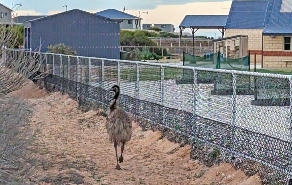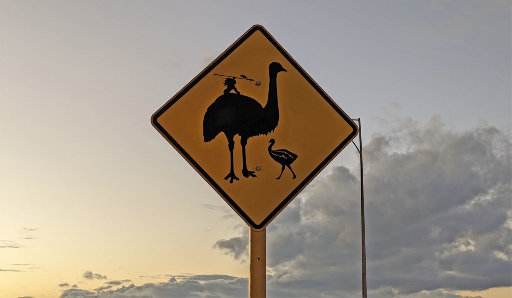 On an exercise walk late in the day, we saw this sign and the emu below nearby. It has been very dry and emus have been in town after water.