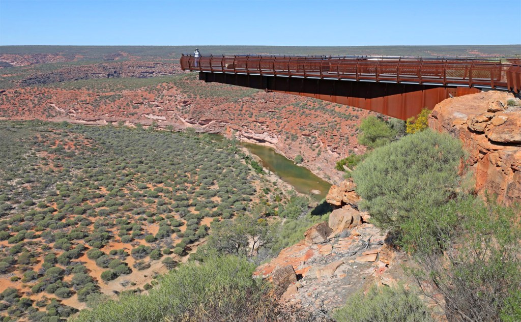 Kaju Yatka – Kalbarri Sky Walk has two cantilevered platforms extending from the cliff edge – two 100m high lookouts projecting 25m and 17m beyond the rim of the Murchison Gorge.