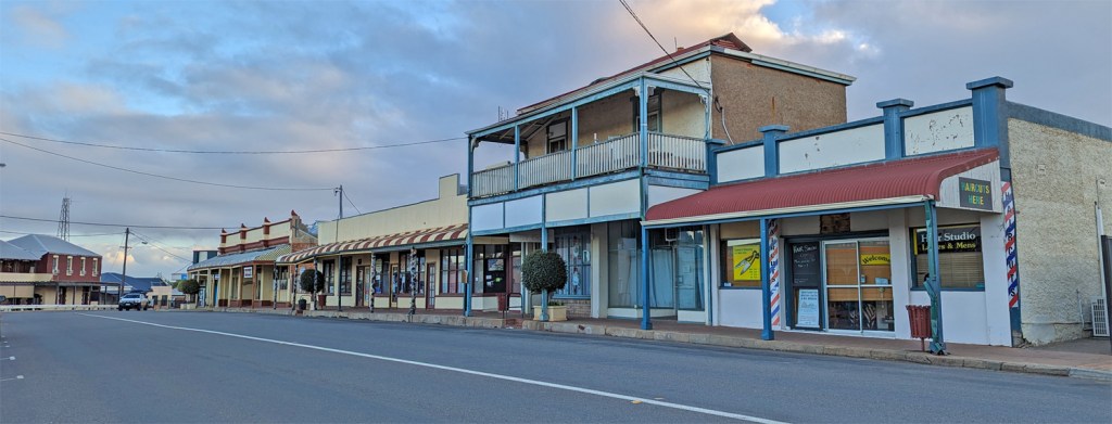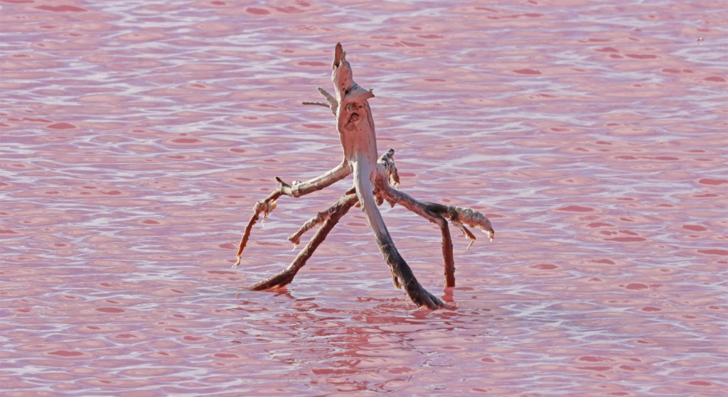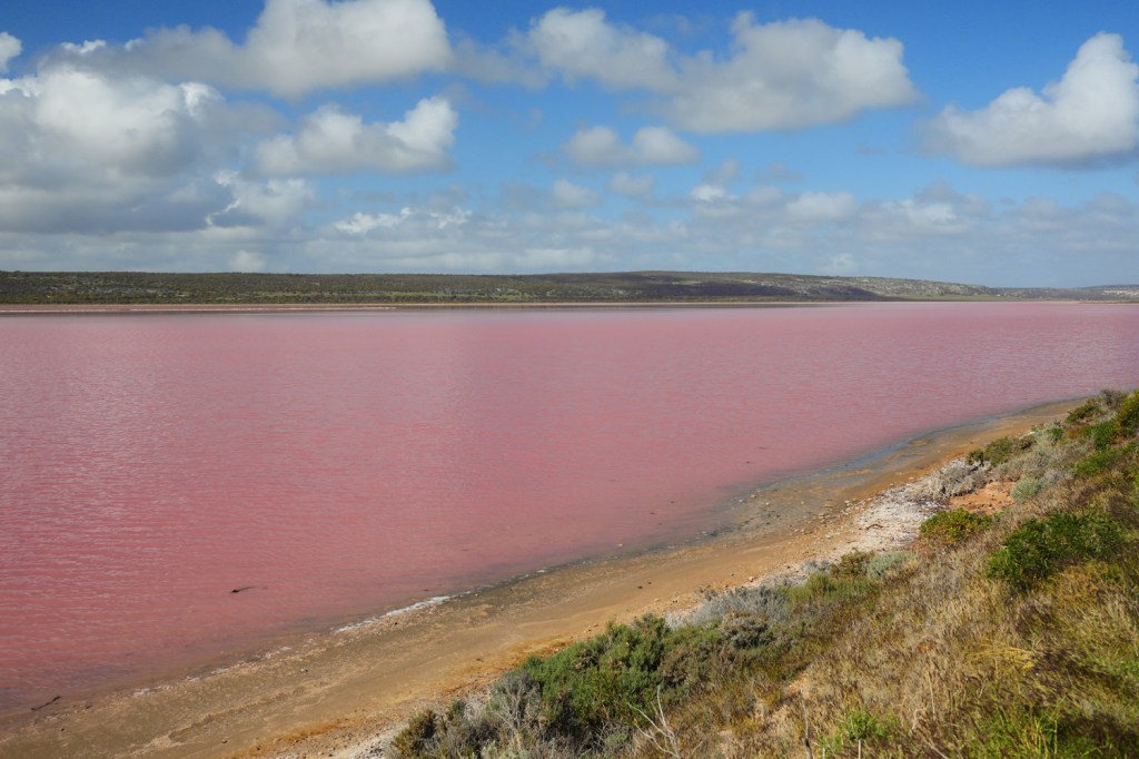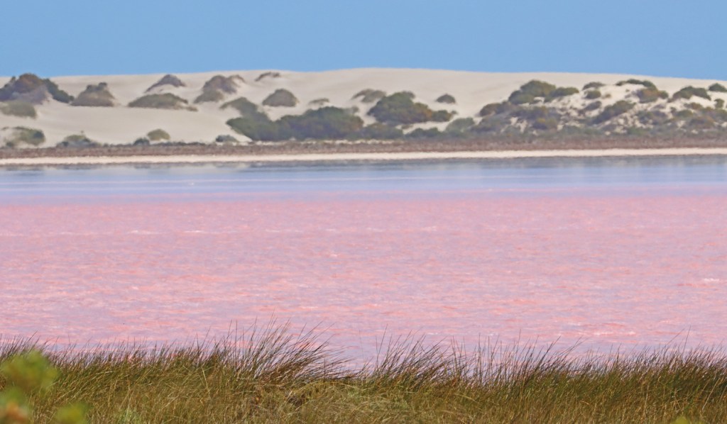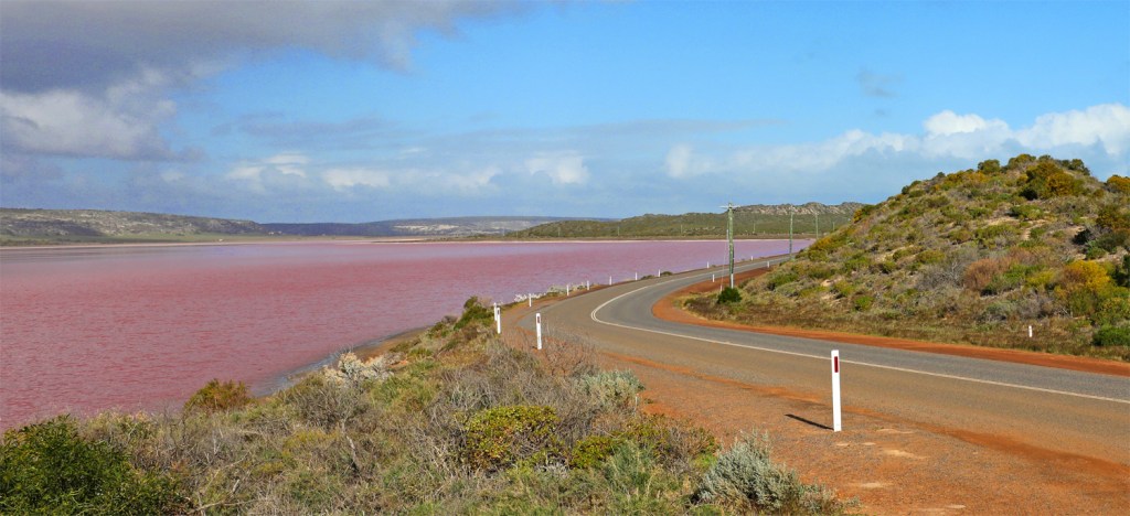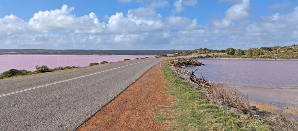 South of Kalbarri we catch glimpses of Pink Lake from its eastern side. Still coming to terms with east meaning away from the ocean.