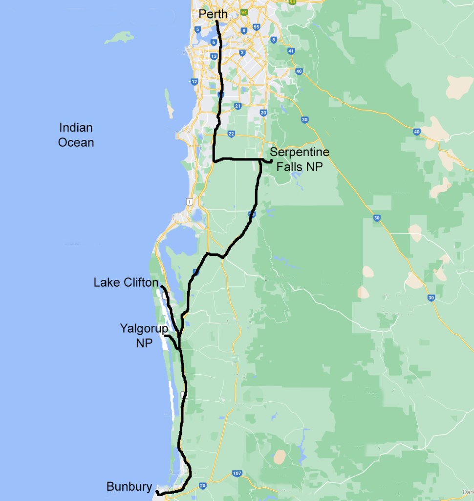 Heading south for about 200km with a detour inland to the Darling Range to see one of the biggest local waterfalls. Serpentine Falls cascading over a sheer granite rock face at the foot of the Darling scarp.