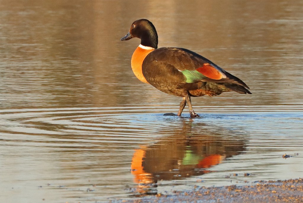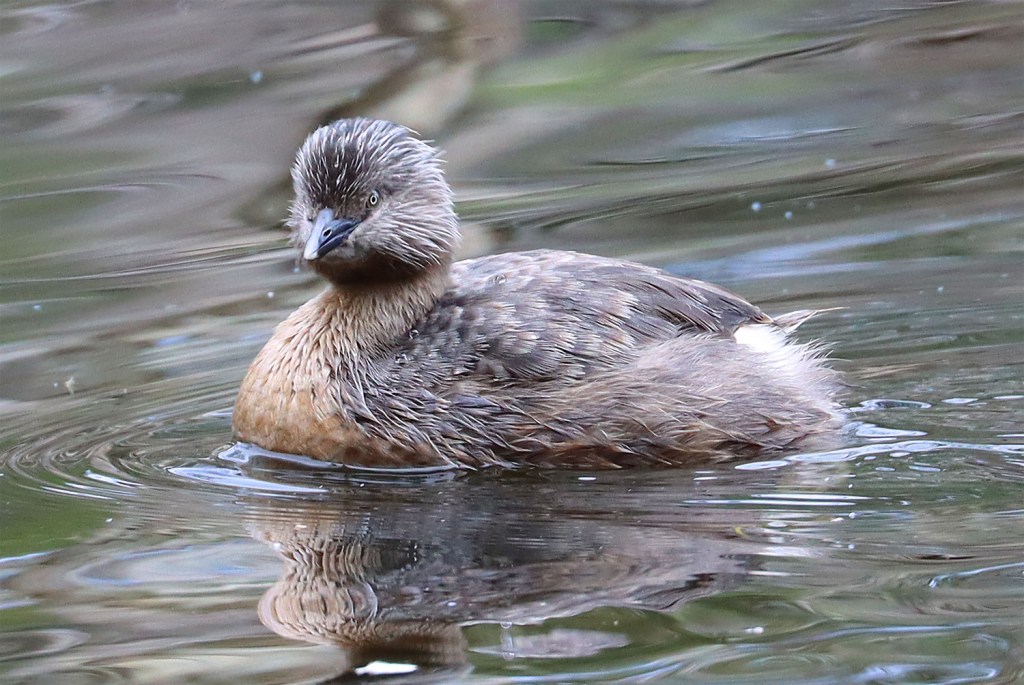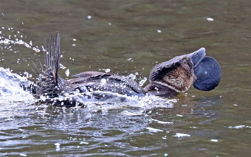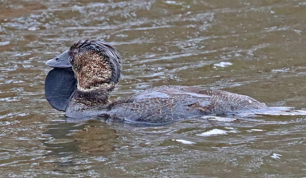 Musk ducks sit very low in the water. They exude a musk odour in breeding season. Adult males have a distinctive large, leathery lobe underneath the bill.