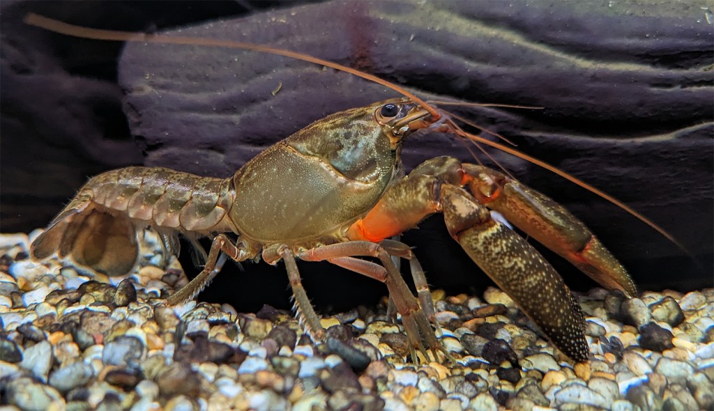 The local Common gilgie (Cherax quinquecarinatus) is a small freshwater crayfish found in two lakes in Perth – Lakes Herdsman and Monger. This was in a tank at the Visitor Centre.
