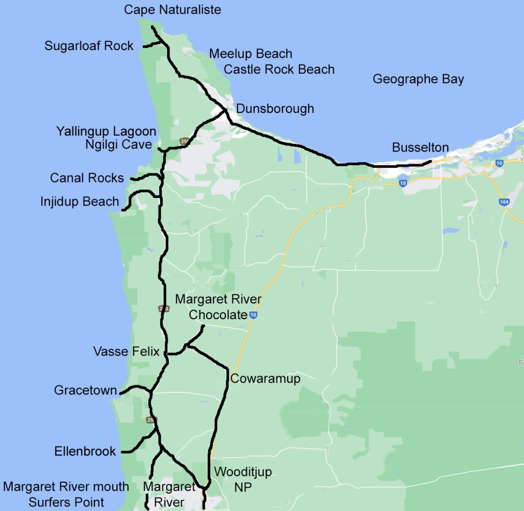 We have moved into the famed Margaret River Region on WA’s south-west coast. The map shows places we intend to visit over the next few days. Cape Naturaliste is the northern most point of Leeuwin-Naturaliste National Park that runs down the coastal strip to Cape Leeuwin. The vegetation varies from coastal scrub-heath to large areas of peppermint, banksia, jarrah and karri forest. There is an extensive network of limestone caves.