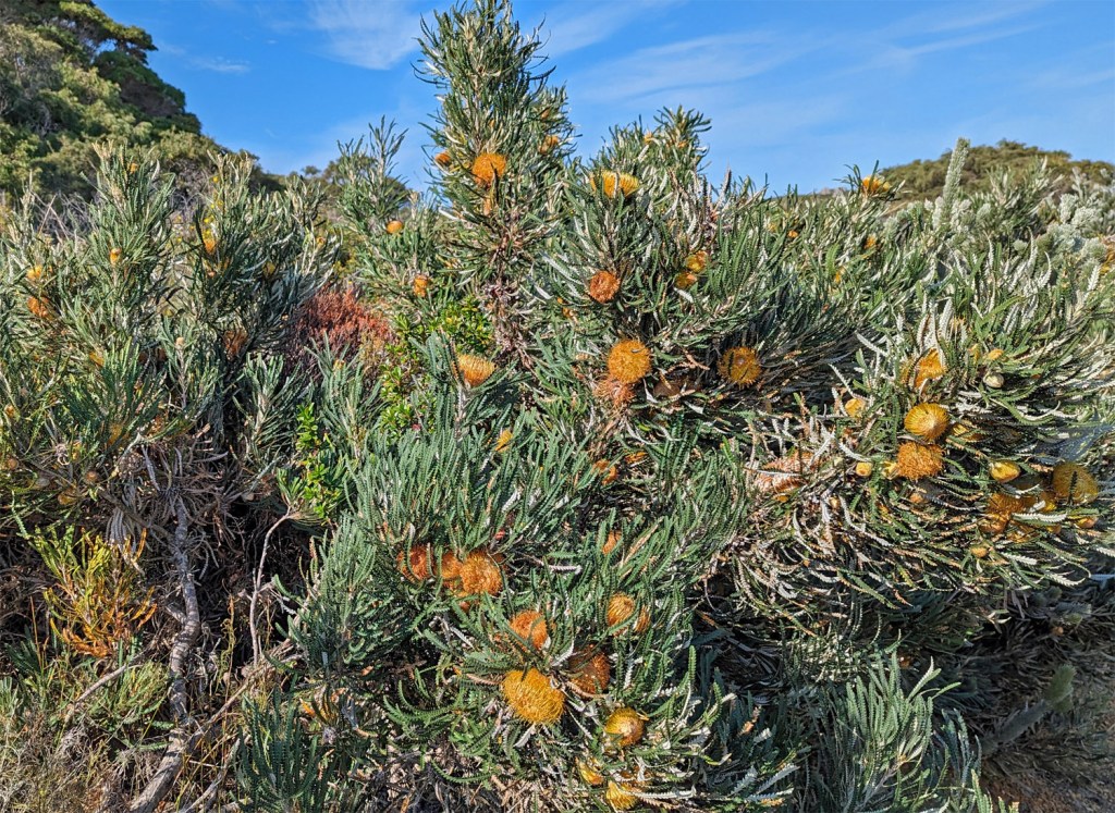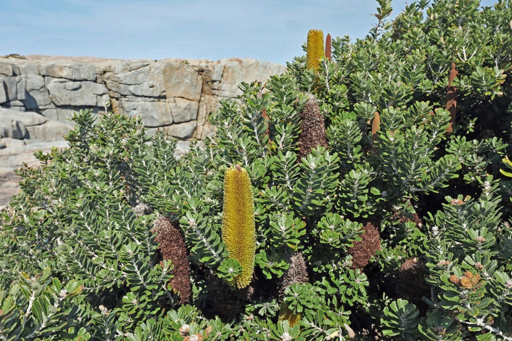 Cut-leaf banksia (Banksia praemorsa) growing on the cliff top near The Gap. This species only occurs in a few isolated populations on the south coast of Western Australia between Albany and Cape Riche (120km east). It is never found more than 2km from the ocean.
