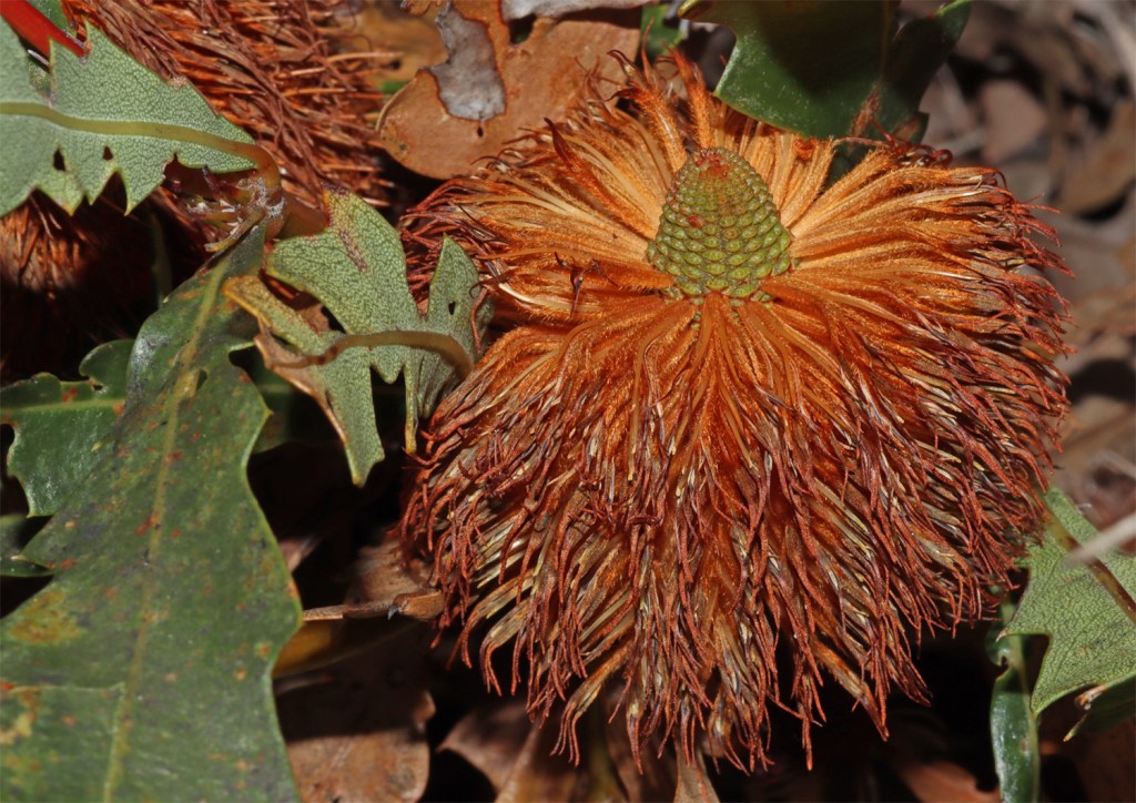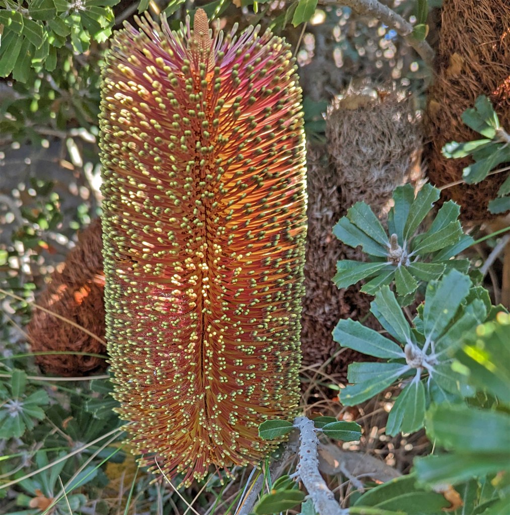 Cut-leaf banksia flowers start yellow-green and turn red.