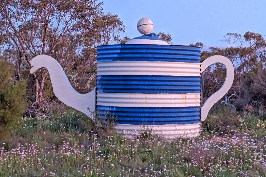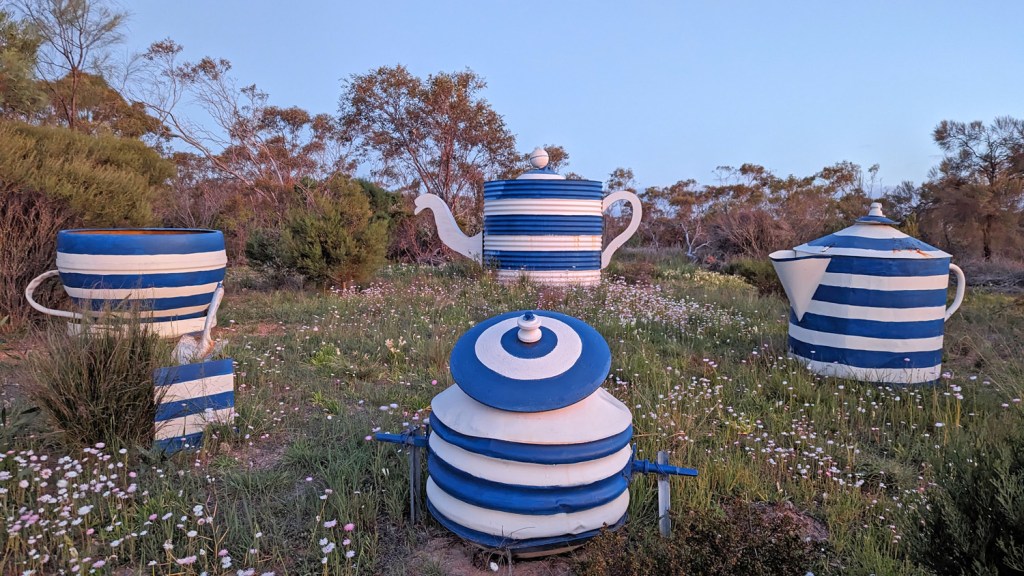 Down the road we saw The Big Teapot. As much as I’ve chai-ed , its been oolong time since I saw such a grand teapot. These guys in the Ravensthorpe District are high achievers because not only do you get to see the Big Teapot, but also on the farmers propertea ….