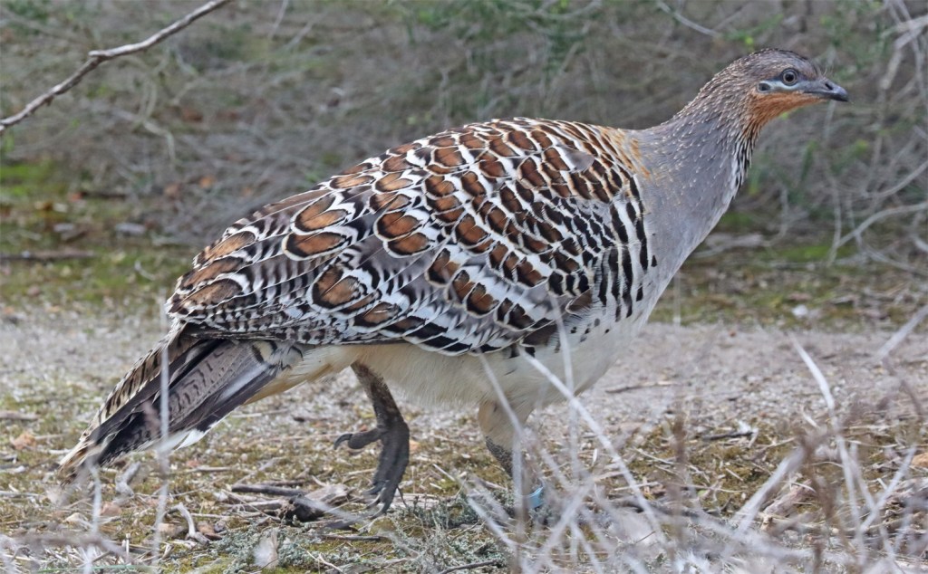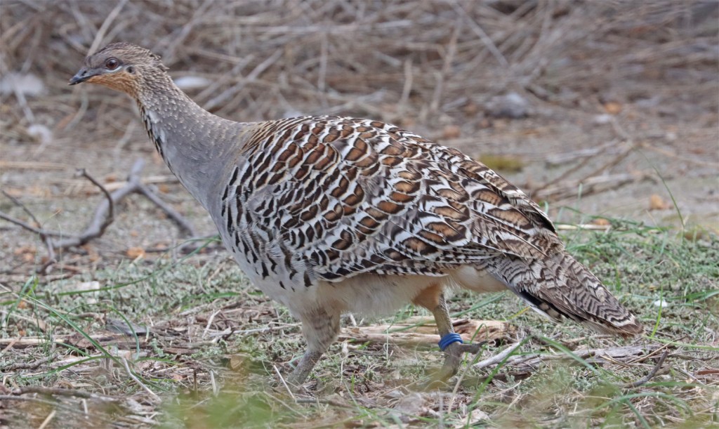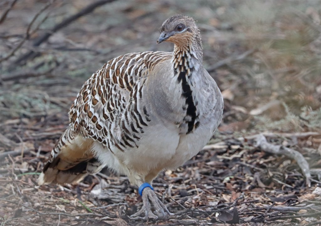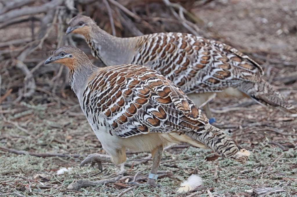 The malleefowl are in large aviaries in a natural mallee bushland setting.