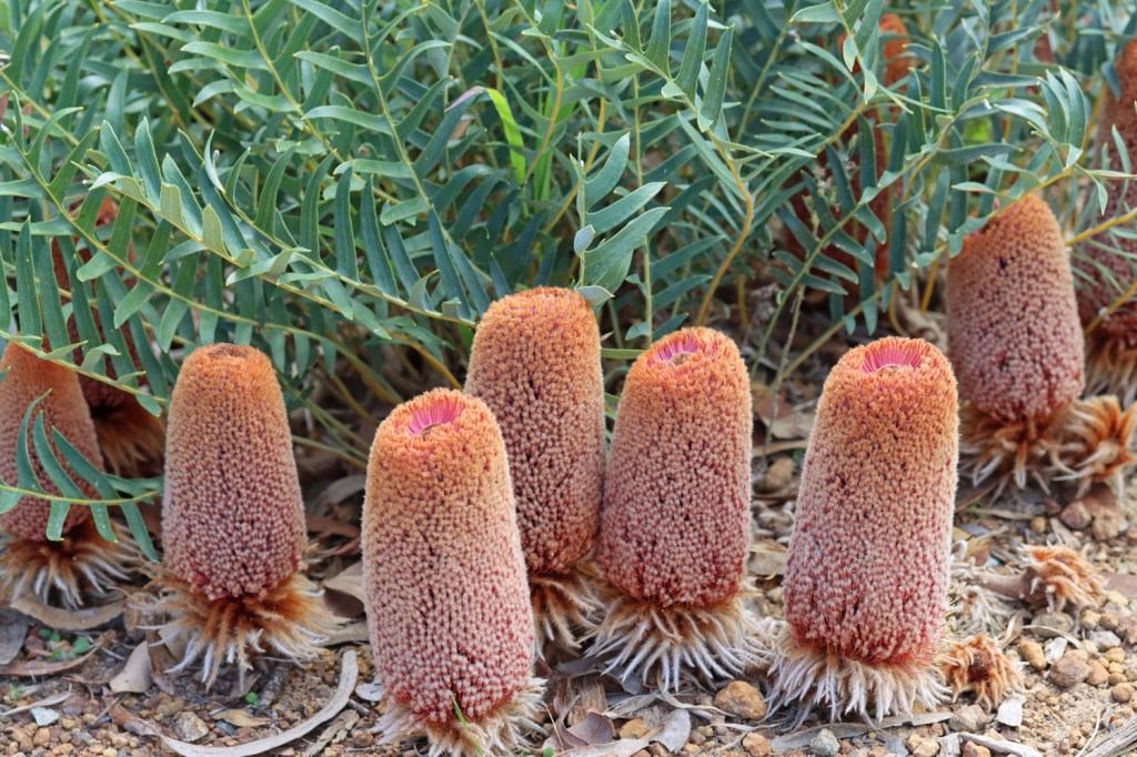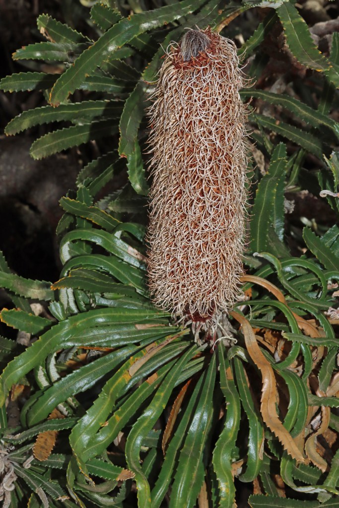Woolly banksia (Banksia baueri) has a limited range along the coast.