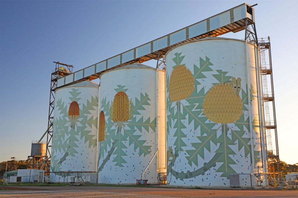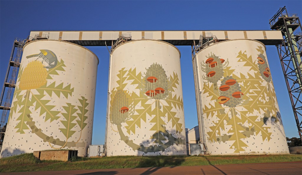 We arrive at Ravensthorpe – Ravy to the locals. The Ravensthorpe Silos display Six Stages of Banksia baxteri across the three silos. Artist Amok Island focused on local flora and fauna. “Each silo side shows a different stage of the flowering cycle of this species of Banksia: from flower buds, to full bloom, to seedpods developing, drying out and opening”. Banksia baxteri is only found between Esperance and Albany. The Honey possum and New Holland honeyeater are this species’ main pollinators.
