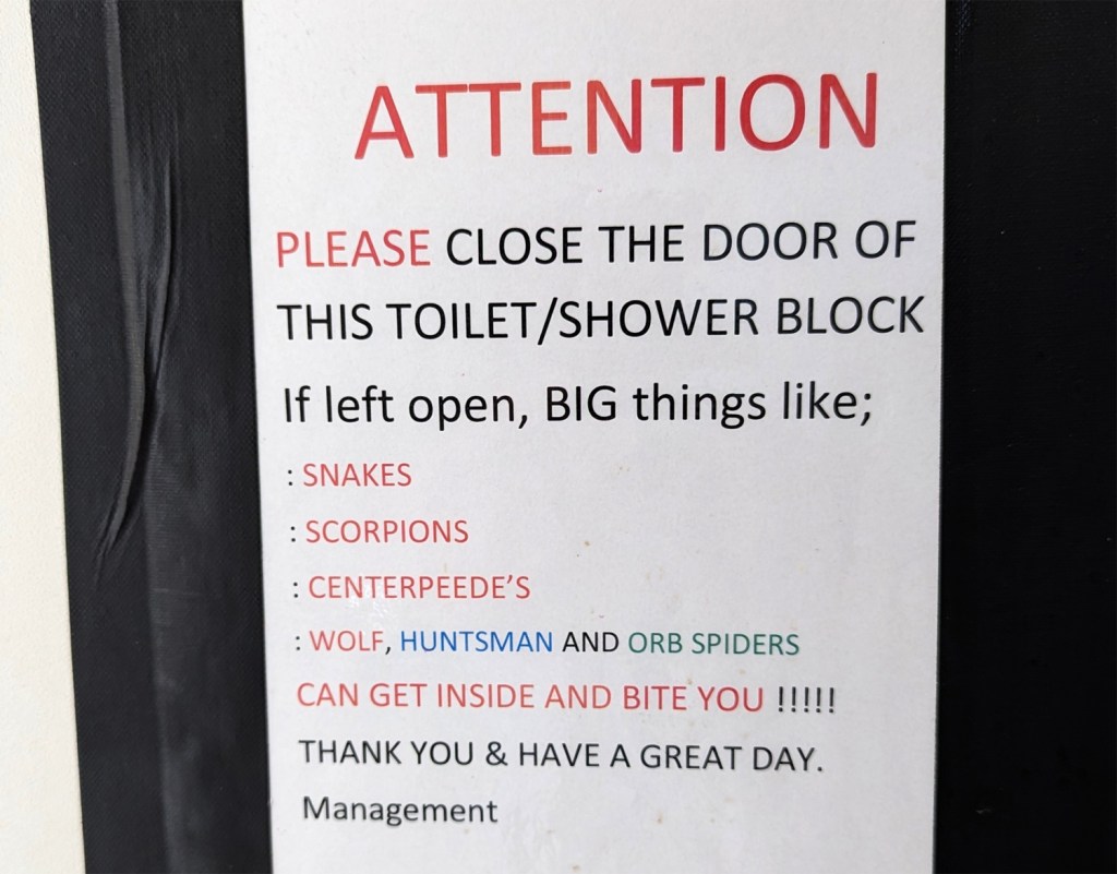 Helpful message on the toilet block door at Cocklebiddy Roadhouse.