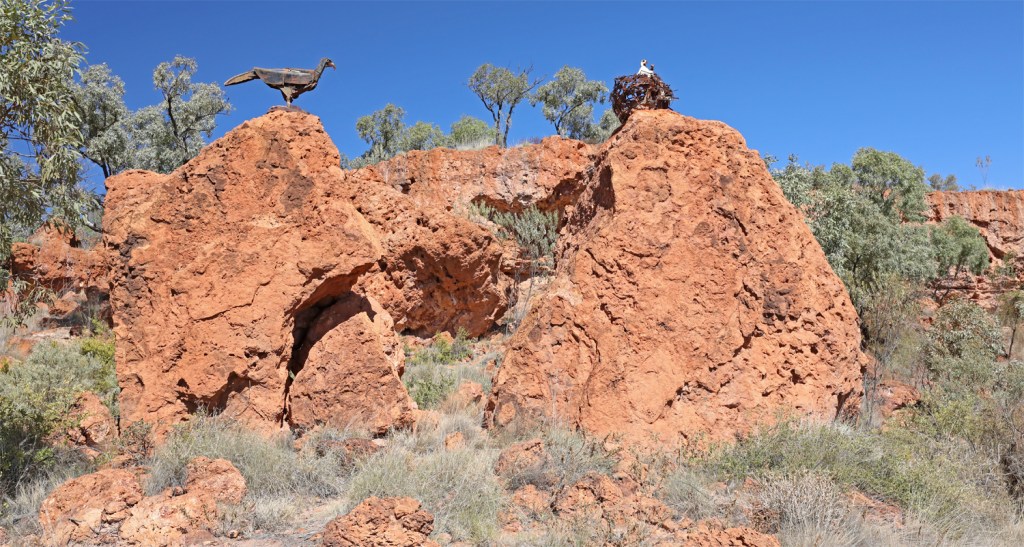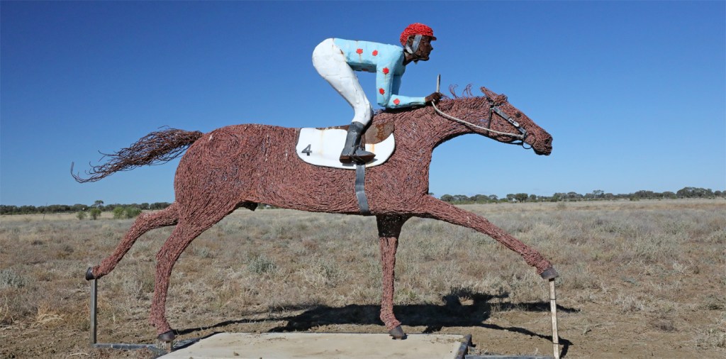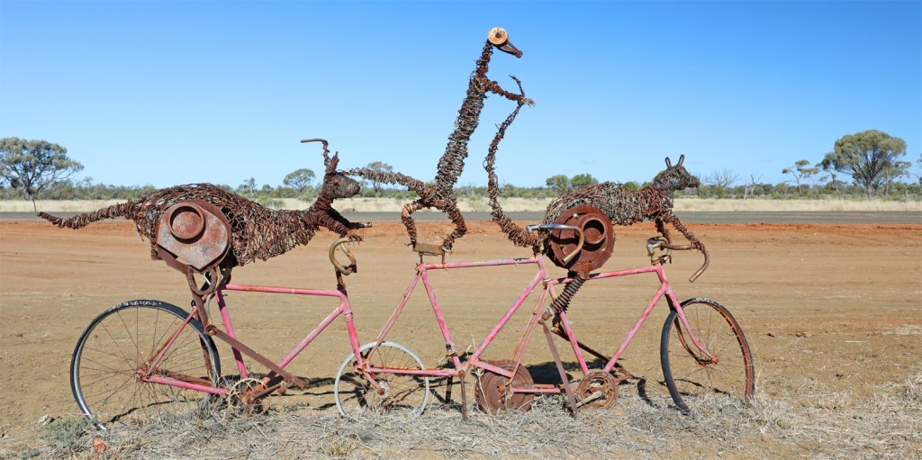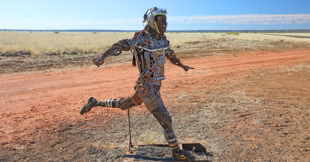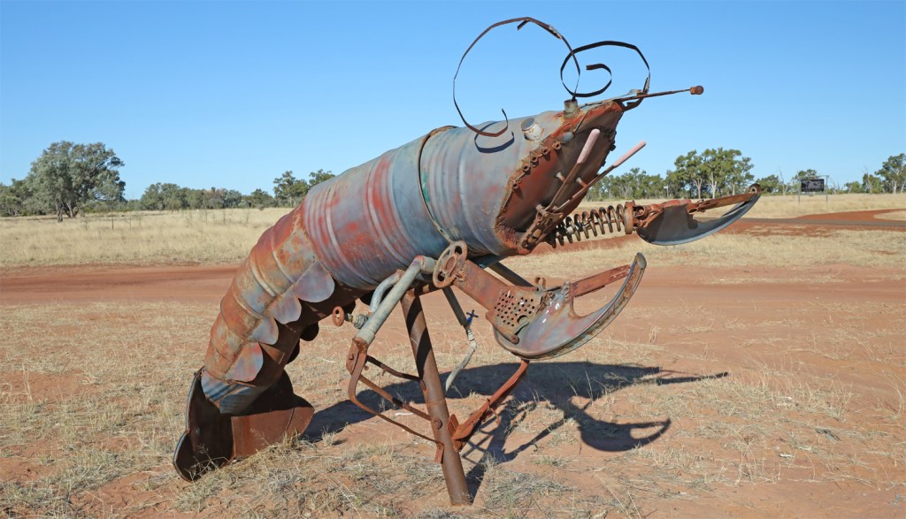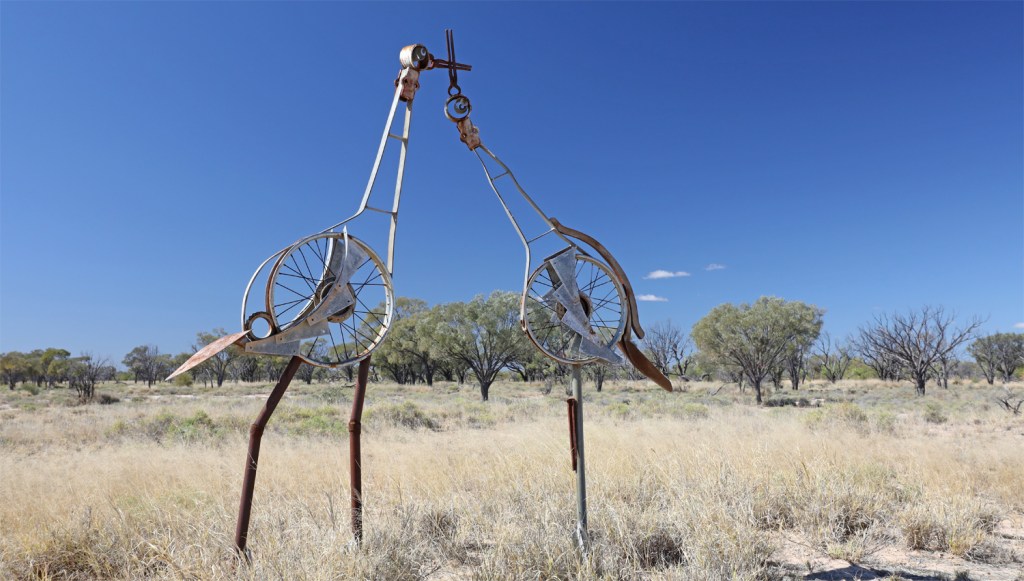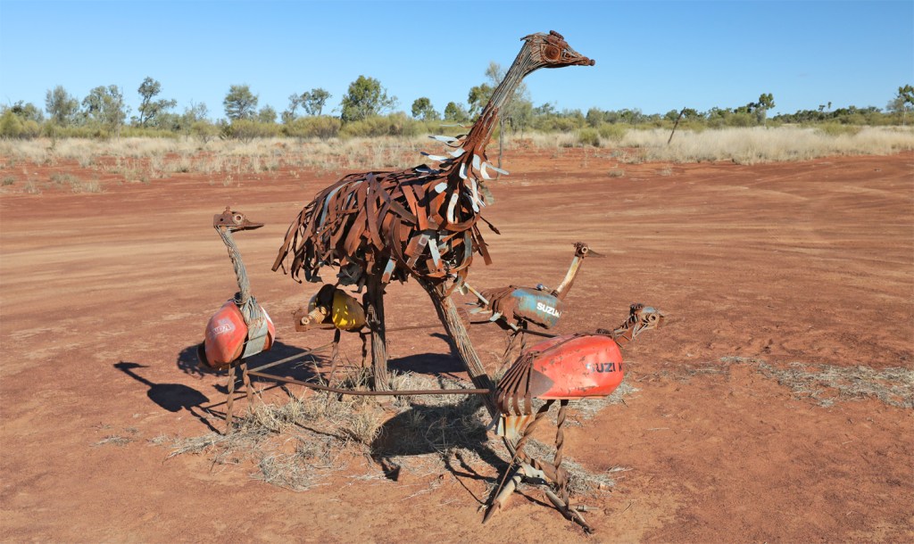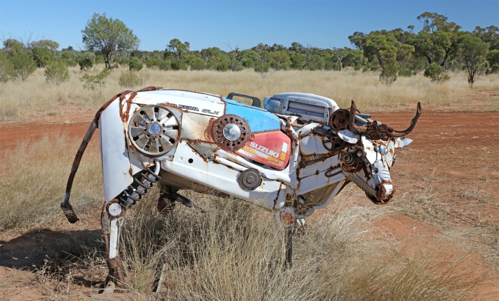 A Barcaldine Regional Council brochure explains how the sculptures were made: “Ask a local and you may be told an interesting story about a sheila with a few roos loose in the top paddock. In reality, the sculptures are the works of a local sculptor, Milynda Rogers, who resided on a grazing property along the trail and decided she needed a platform to display her work. The result is one of the biggest, permanent, outdoor sculpture exhibitions in the world. She has combined her love of sculpture and incredible ability to turn junk into art to fulfil her wish to put a smile on people’s faces.”