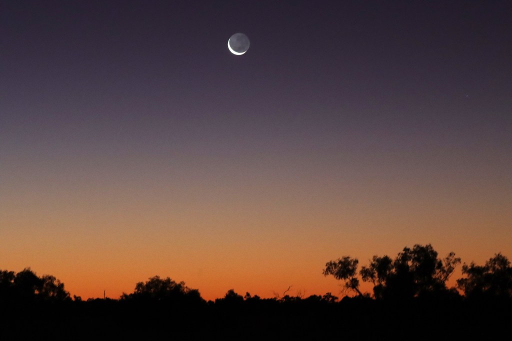Winton sunset with new Moon. Thought for the day – if you’re taller, the sunset lasts longer.