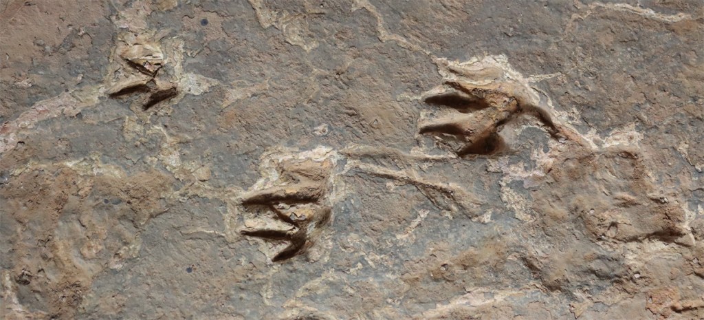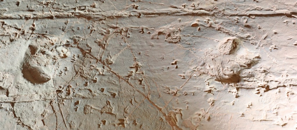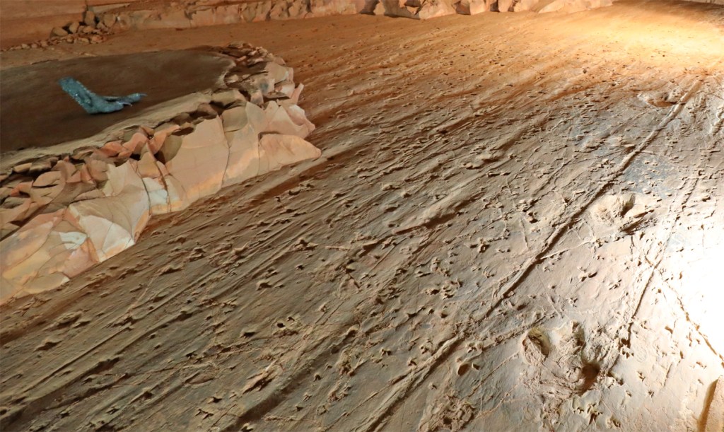 There are over 3000 separate dinosaur footprints. It is believed a large meat eating dinosaur startled a huge number of smaller dinosaurs causing them to flee across the muddy surface. This surface was then flooded with more sediment preserving the footprints.