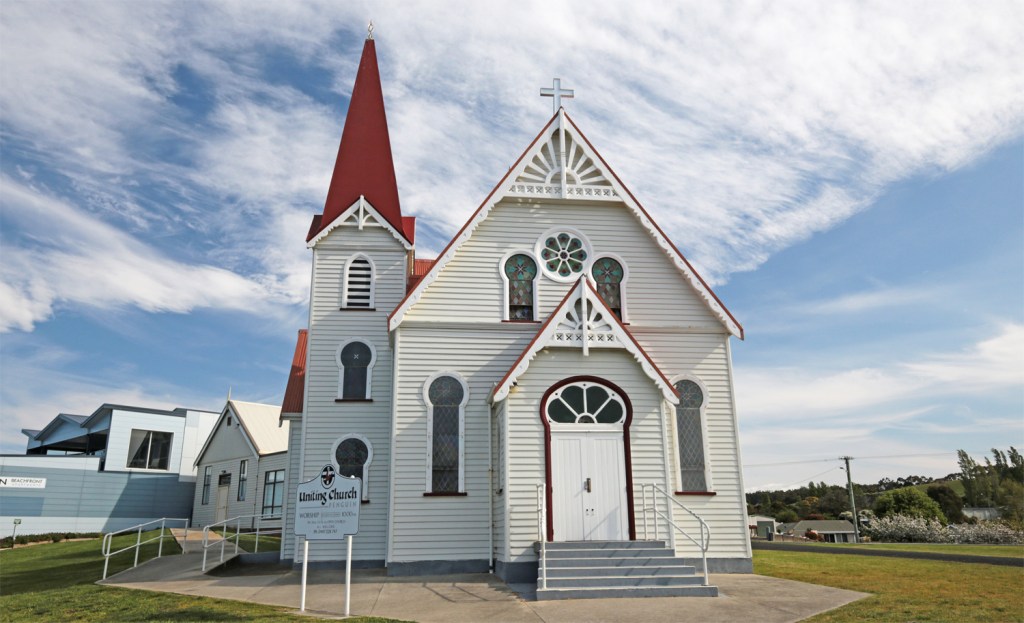 Penguin Uniting Church with unusual keyhole windows. It was locked when we were there.