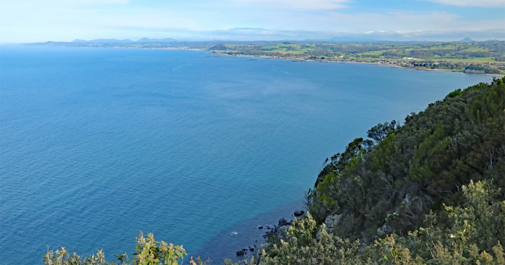 Table Cape is a circular extinct volcano with a flat top rising steeply from Bass Strait. It was named by Matthew Flinders on his circumnavigation of Tasmania in 1798. This is the view east from Table Cape.