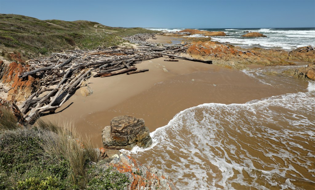 Edge of the World lookout at Arthur River has a massive amount of timber washed down the river in flood.