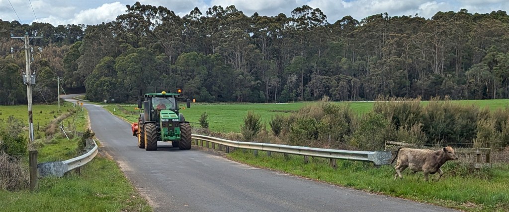 Many farms have a sculpture of some sort near their gate. We saw Super Duck and many oddly dressed mannequins in the past days. This is a solid entry in the field made from old tractor parts. Extra points for the Hi-Vis.