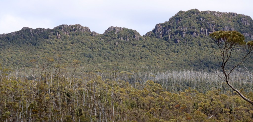 The Devils Backbone from the Arve River walk. Cutting grass (Gahnia grandis) is a feature of sub-alpine areas.