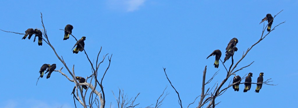 Yellow-tailed black cockatoos drying out after the wet morning.
