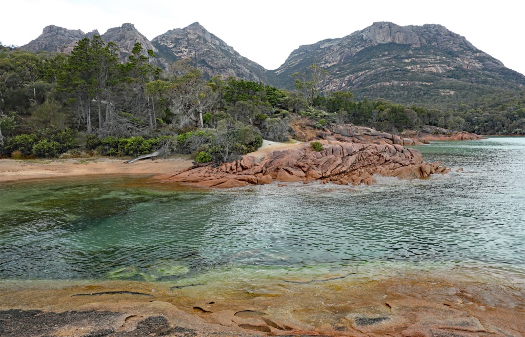 Sleepy Bay is a beautiful rocky bay with turquoise waters and orange lichen-encrusted rocks.