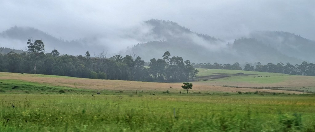 Another wet start to the day – hills behind the highway from St Helens to Falmouth