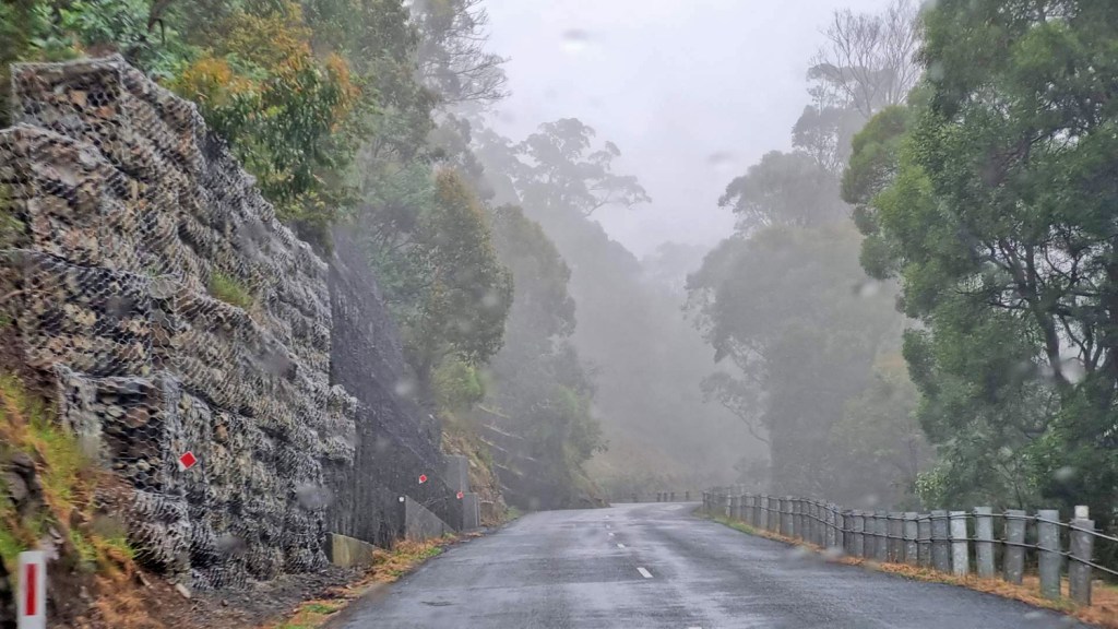 A Severe Weather Alert for wind gusts up to 100km/hr on high ground was forecast. We changed our route today as the other way we wanted to go has three mountain passes and is notorious for treefall on the road. Even this way, we were in the Severe Weather forecast zone but on a much better road. There were very strong periodic wind gusts.