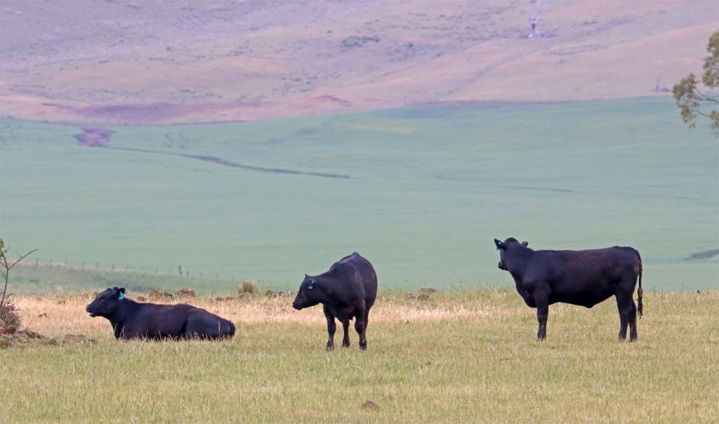 Angus cattle contrasting with the pastel hues of the valley.