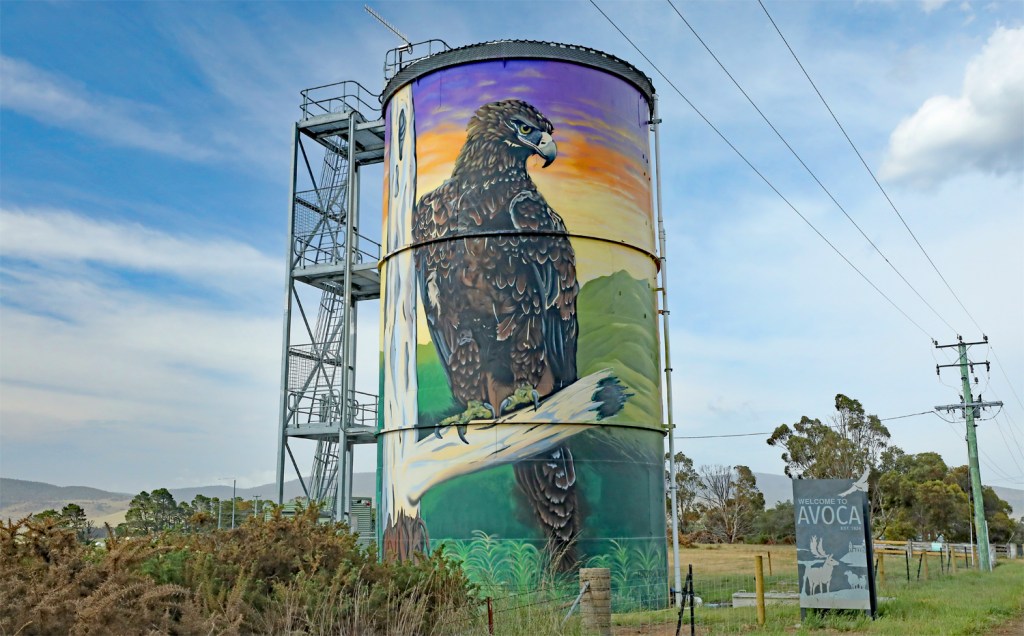 Water tower in Avoca with a Wedge-tailed eagle on one side….