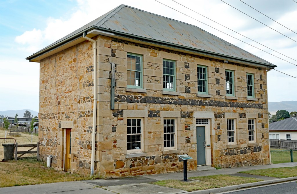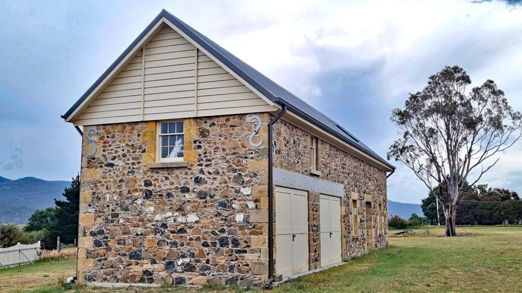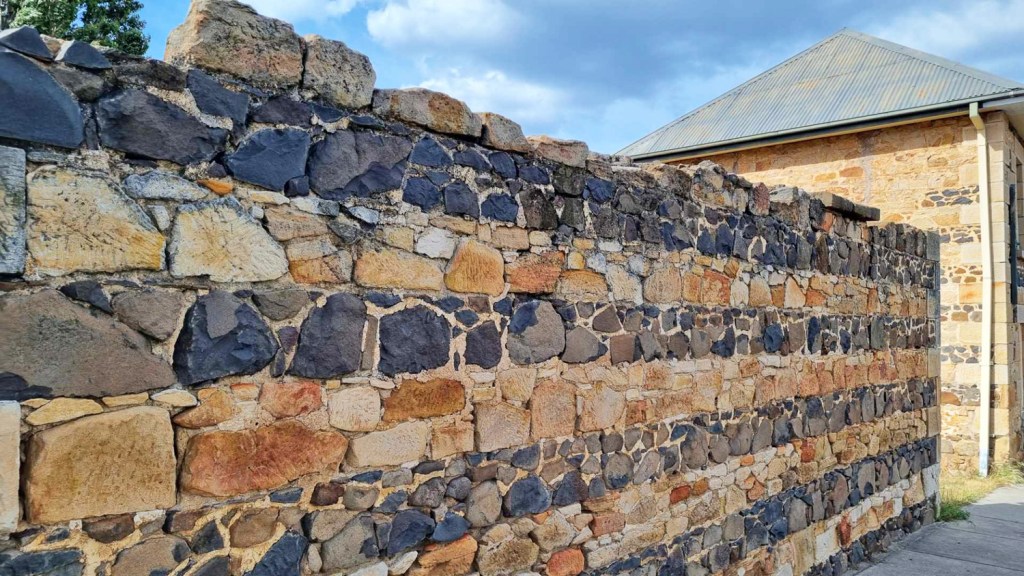 An old stables wall from a coaching service that ran from Avoca to St Marys beginning in 1852 with distinctive alternating rows of sandstones and volcanic rocks.
