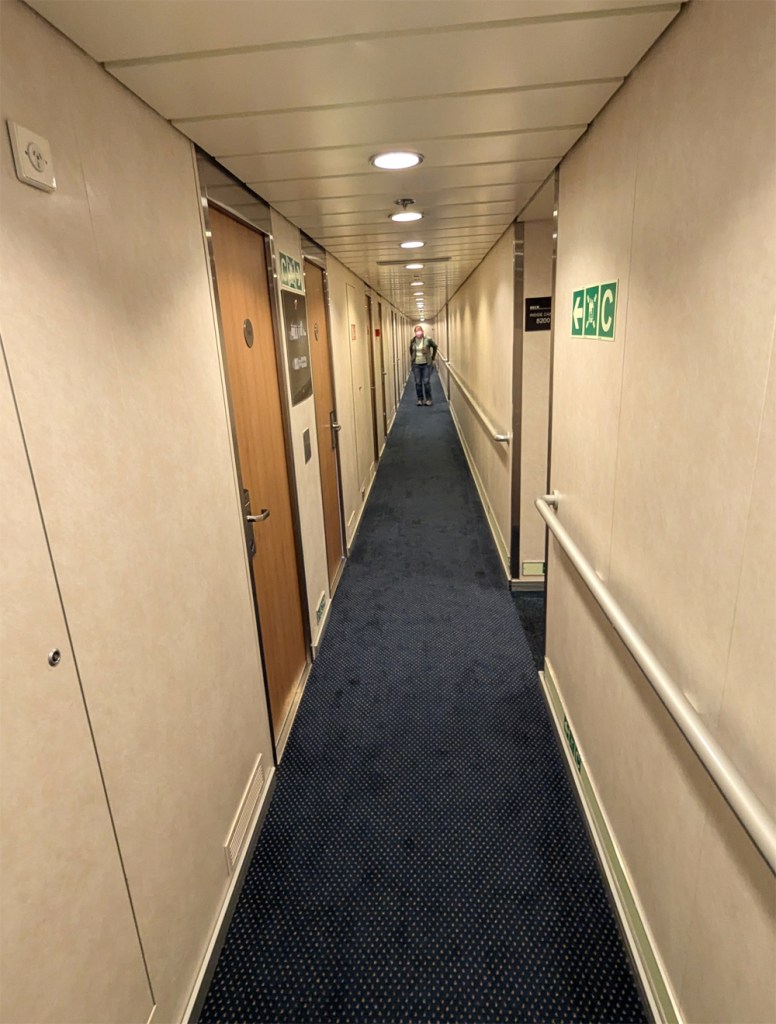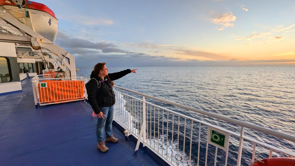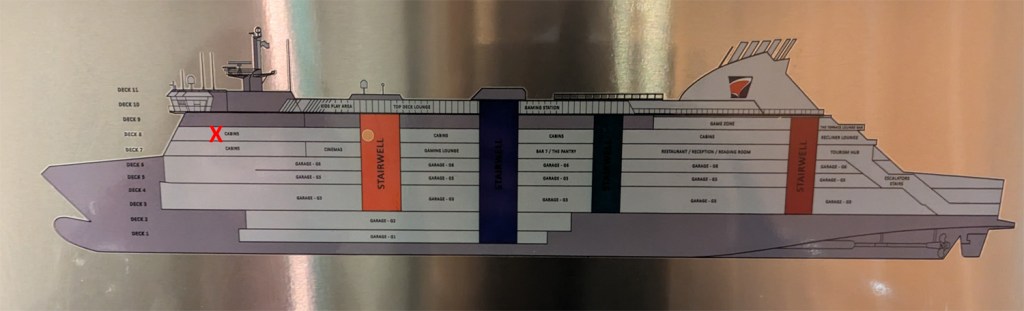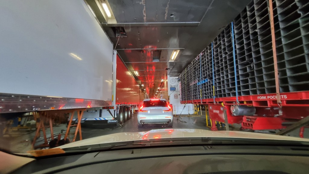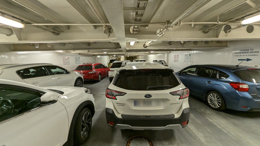 On the voyage over, we were one of the first cars off, this time one of the last. We were parked on the lowest deck in a wedge towards the front of the ship, having to wait for cars behind us to depart before doing a three point turn to drive out.