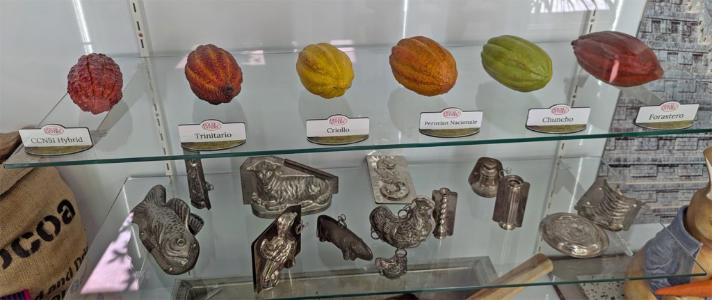 Varieties of cacao pods are on display along with an extensive display of historical moulds.