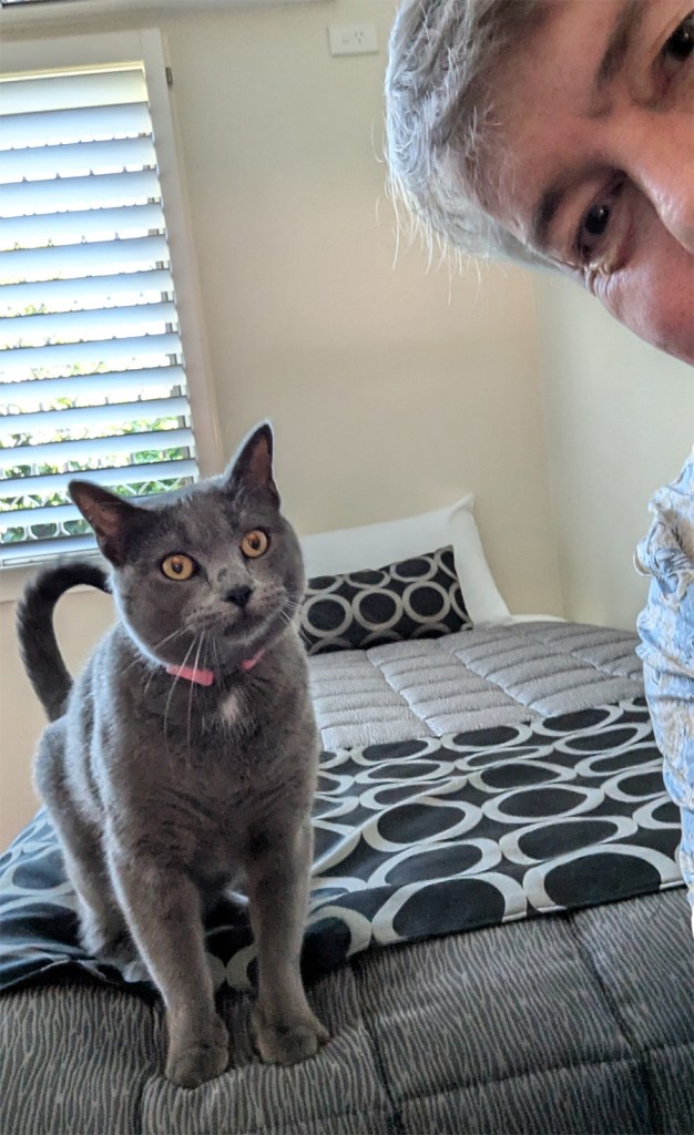 One of three motel cats we met at our overnight accommodation in Goondiwindi. After a while, I nicely asked the Russian Blue to vacate our room. All I got back was, “Нет, нет, я хочу погладить.”
