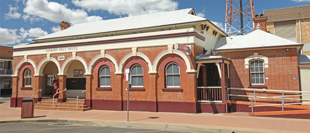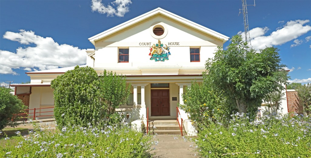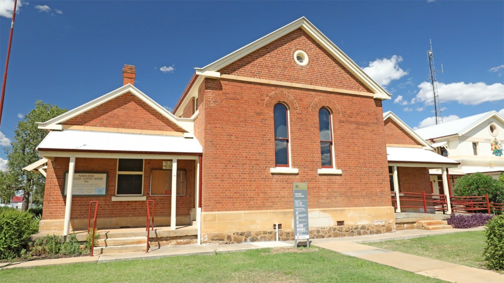 The old bridge entrance into Goondiwindi over the Macintyre River is more grand than the newer bland concrete structure.