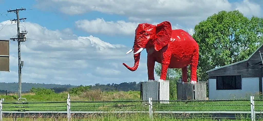 The Big Red Elephant at Hatton Vale lives at the Jumbo shopping centre. It is on Big Things of Australia lists but is pretty much a 1:1 scale model.